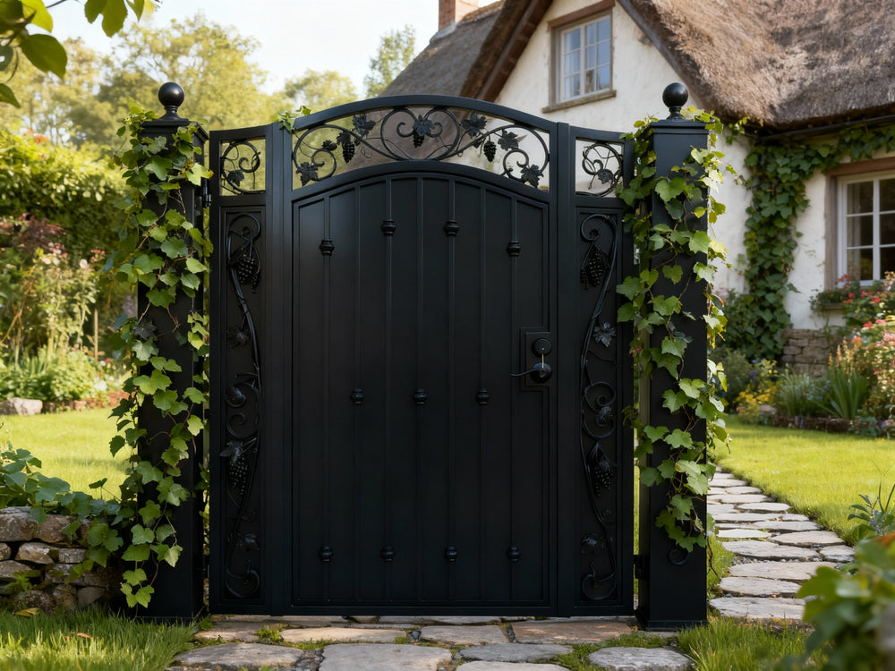 A door that celebrates craftsmanship and nature’s elegance. Vinecrest Passage features a solid central panel with vertical lines and a curved top, framed by side and overhead panels adorned with hand-forged vine and grape motifs. The twisting scrolls and clustered leaves evoke vineyard serenity and classical artistry—ideal for garden entries, side passages, or estate transitions that blend ornamental beauty with secure functionality.