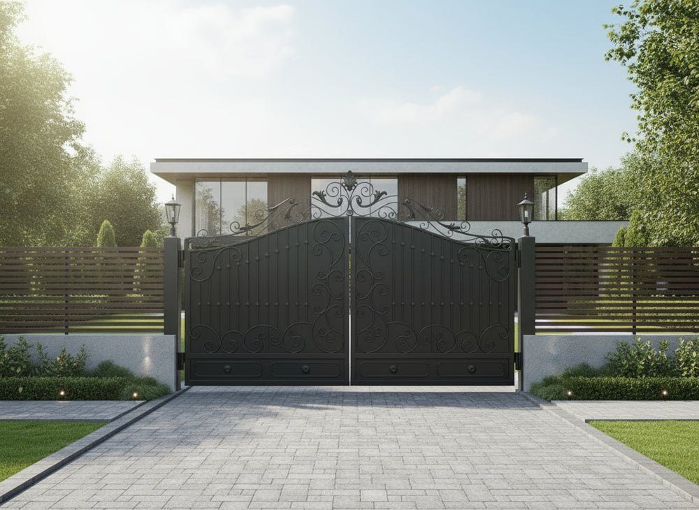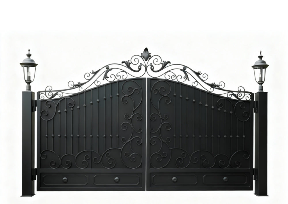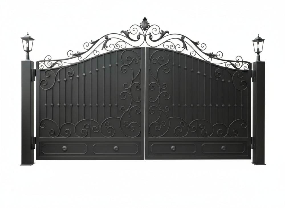 A gate that blossoms in iron. Vinecrest Élan features dual swing panels adorned with intricate scrollwork and floral motifs, crowned by a graceful arch and pointed finials. The symmetrical layout is framed by tall black posts topped with classic lanterns, offering both visual drama and nighttime charm. This design evokes the elegance of botanical gardens and the prestige of heritage estates.