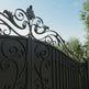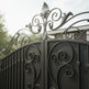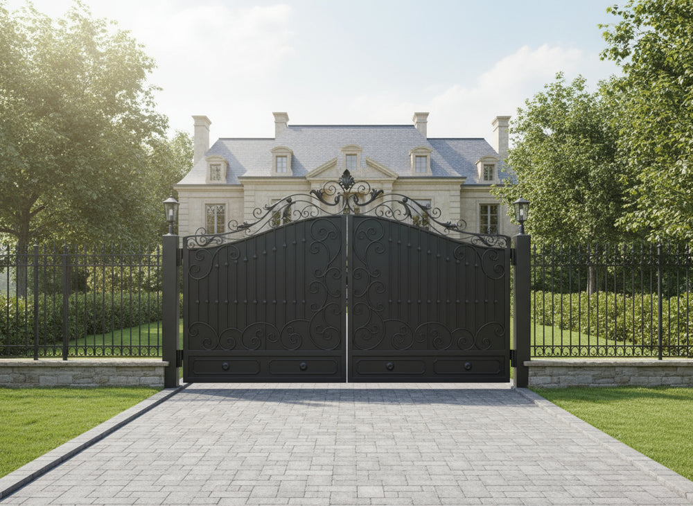 floral scroll wrought iron gate, arched estate gate, lantern post entrance gate, Canadian custom gate, Taimco decorative gate, heritage property gate, heavy-duty ornamental gate, luxury driveway gate design