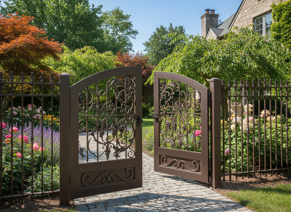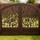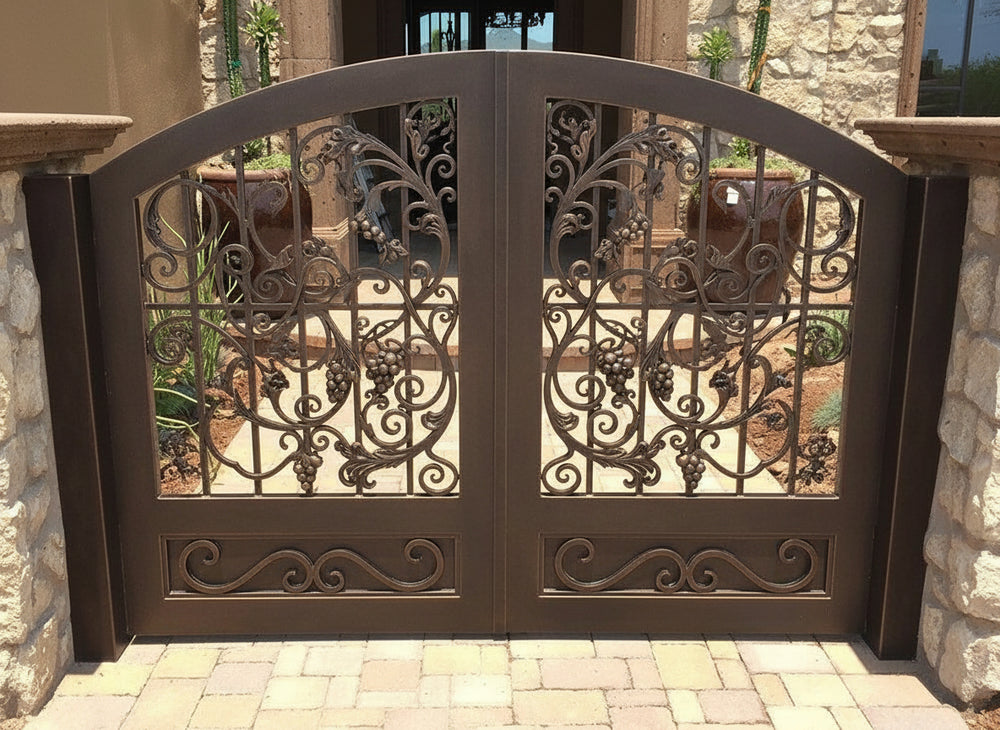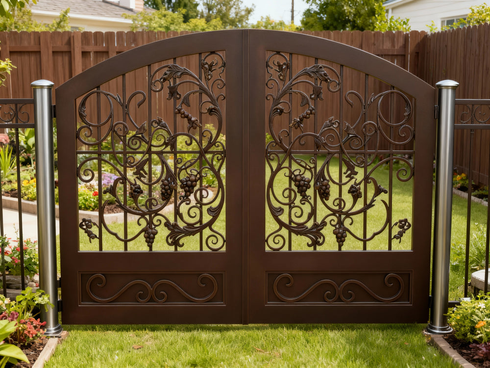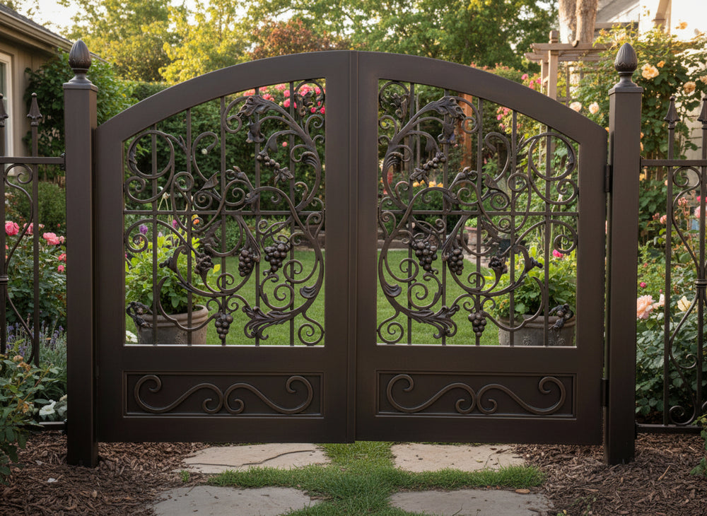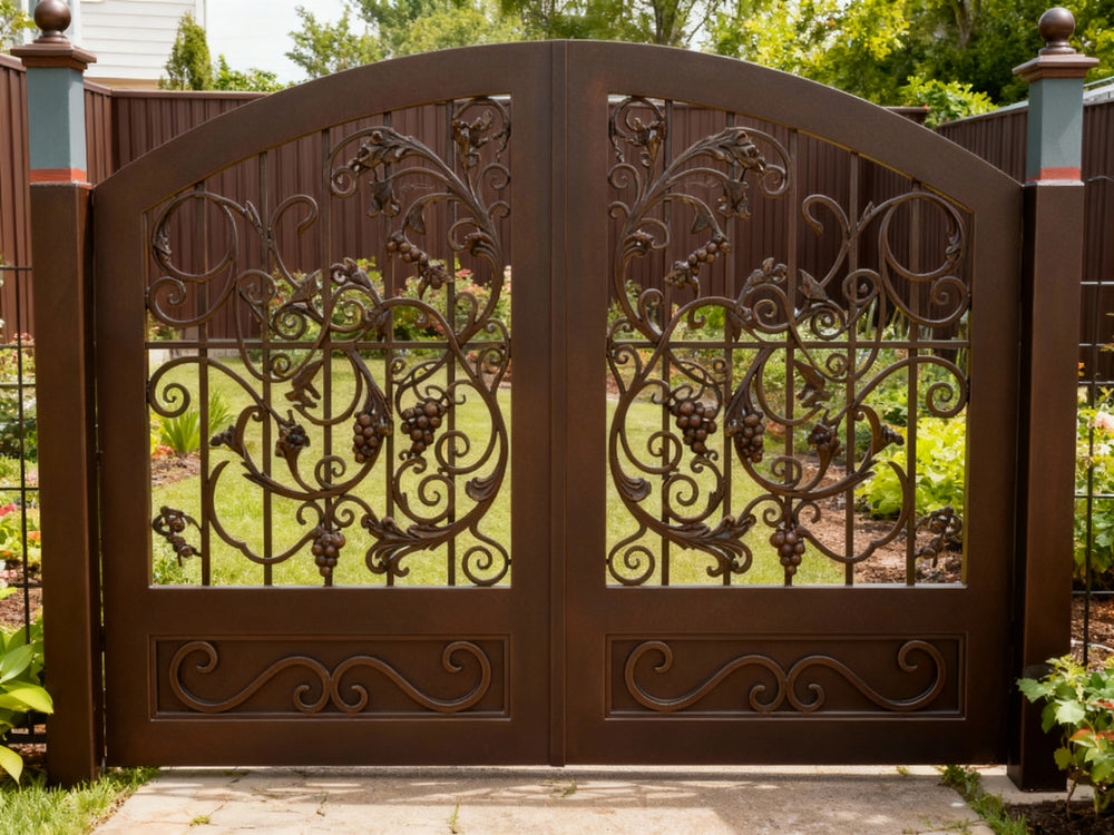 A door that blends vineyard elegance with fortified design. Vinecrest Elite features symmetrical scrollwork and grapevine motifs across both panels, crowned by an arched top and anchored by a solid lower section with embossed detailing. This composition offers privacy, artistry, and architectural presence—ideal for estate entries, garden transitions, or decorative side gates that demand both beauty and strength.