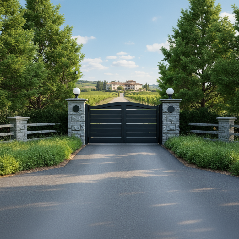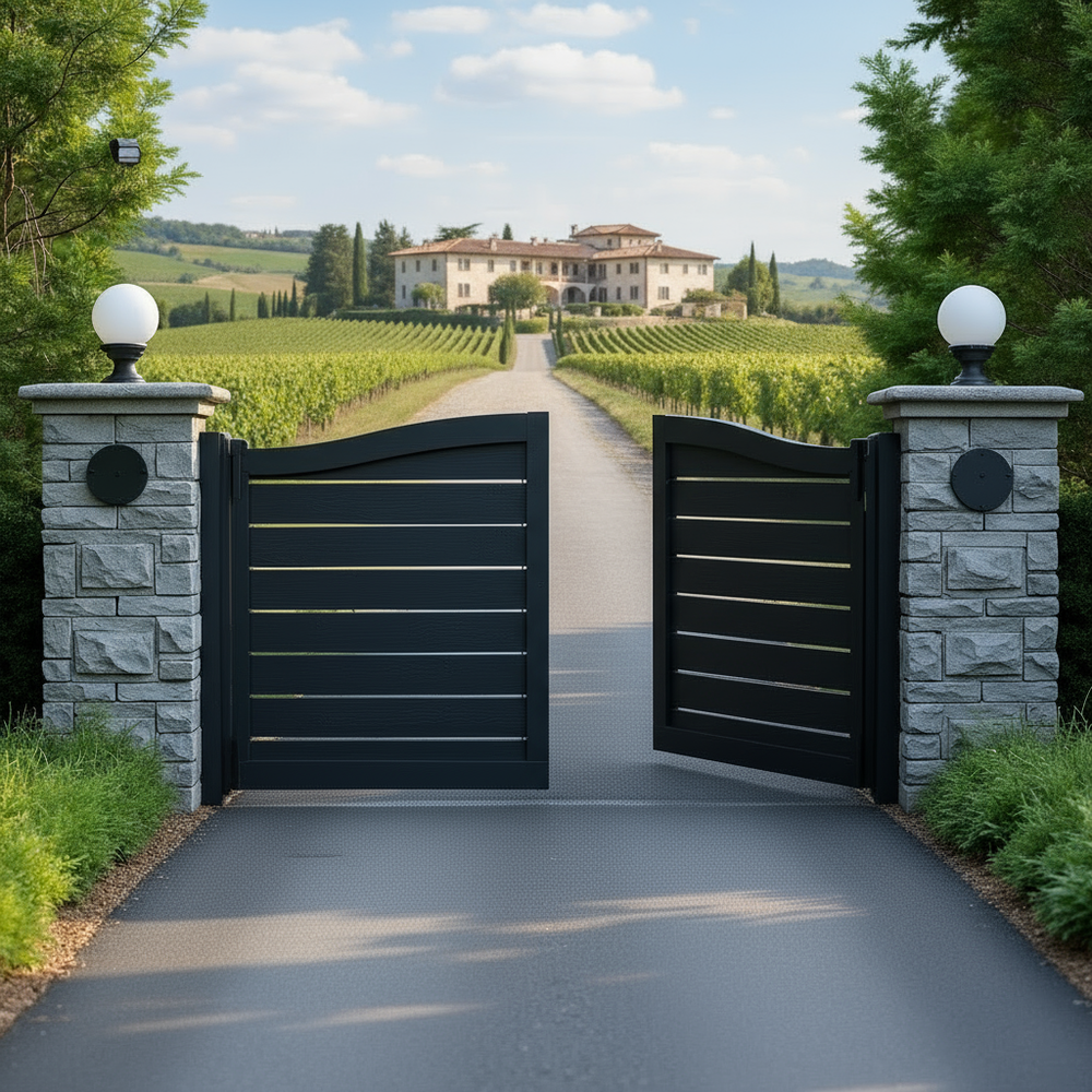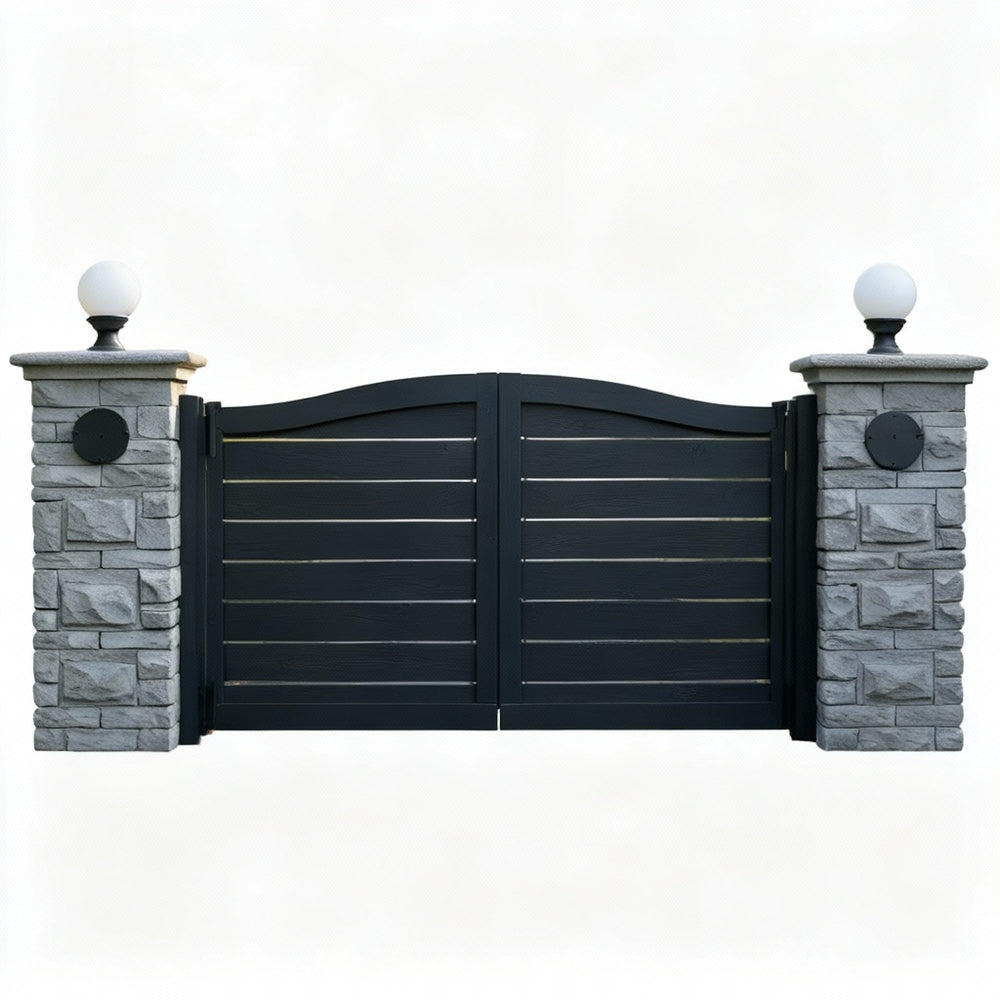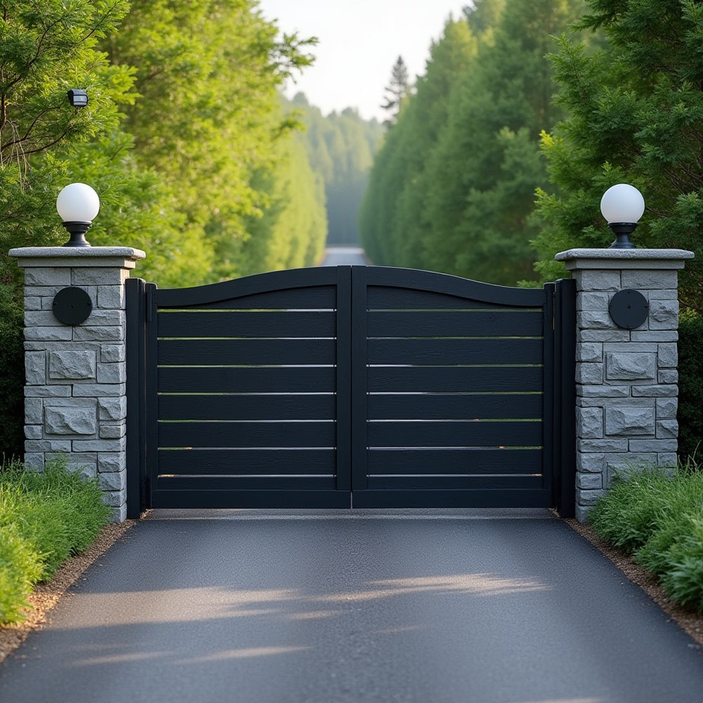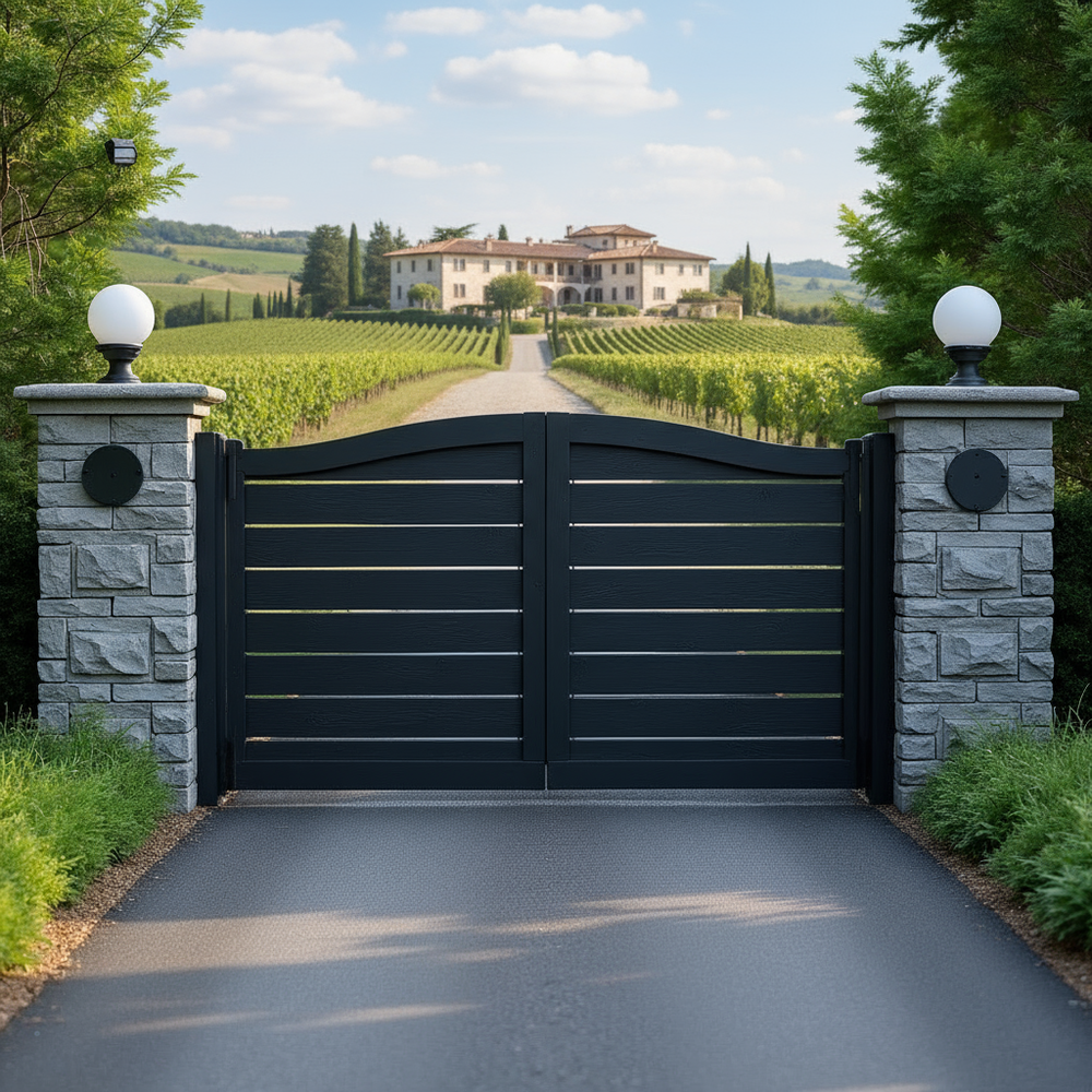 Frame your legacy with Vintara Crest, a double-leaf gate featuring precision-aligned horizontal slats and a subtle arch that echoes the rolling hills of vineyard country. Flanked by stone pillars topped with spherical lamps, this gate offers privacy, symmetry, and timeless elegance—perfect for estates that blend natural beauty with architectural refinement.
