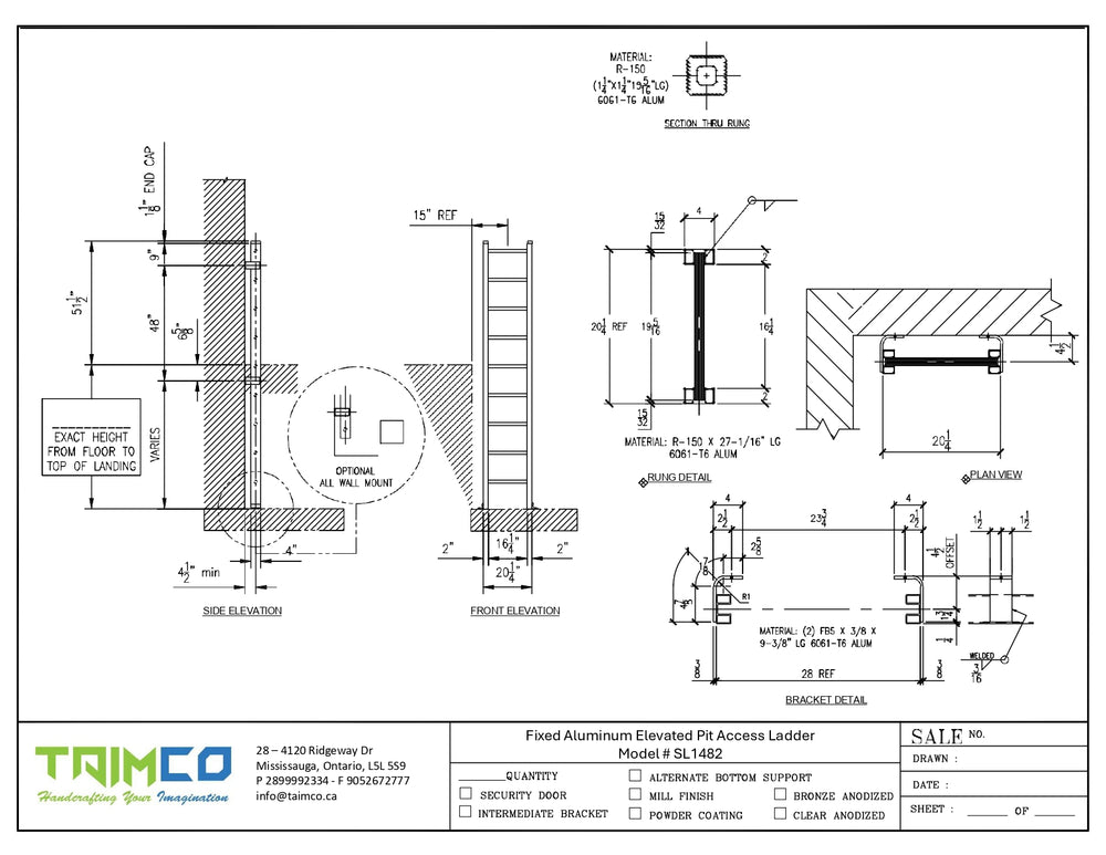 TAIMCO aluminum ladders and their components are fabricated from 6061-T6 aluminum alloy for added safety, strength, and long-lasting durability, with no painting required. Model SL1482 fixed wall elevator pit ladders include side rails with 1-1/8" (29 mm) round rungs that are serrated and secured with cast aluminum connectors, 4 solid rivets, and 3/8" (9.5 mm) thick brackets mounted to the walls.