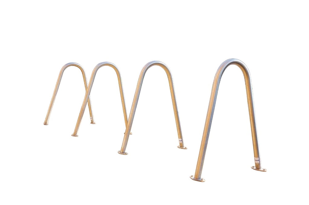 This heavy-duty bike Bumper Shape stand is designed to accommodate up to 10 to 15 bicycles and is suitable for commercial use. It can be used as a single- or double-sided unit and can accommodate most bike tire sizes. The stand is constructed from rugged steel tubing and features a welded grid and side rails that provide strength and stability. The side rails tubes have a diameter of 1-1/2" and are made from 14-gauge steel.