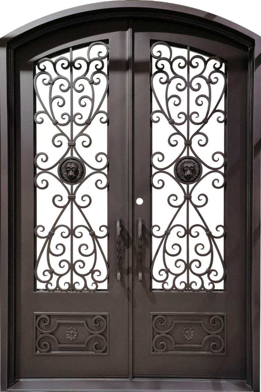 arched wrought iron entry door lion motif metal doors twisted scrollwork iron door black iron exterior doors Canada model IWD 1056 by Taimco decorative kickplate steel doors custom wrought iron doors powder-coated galvanized doors ornamental security entry doors premium iron doors for home facade
