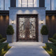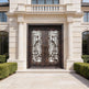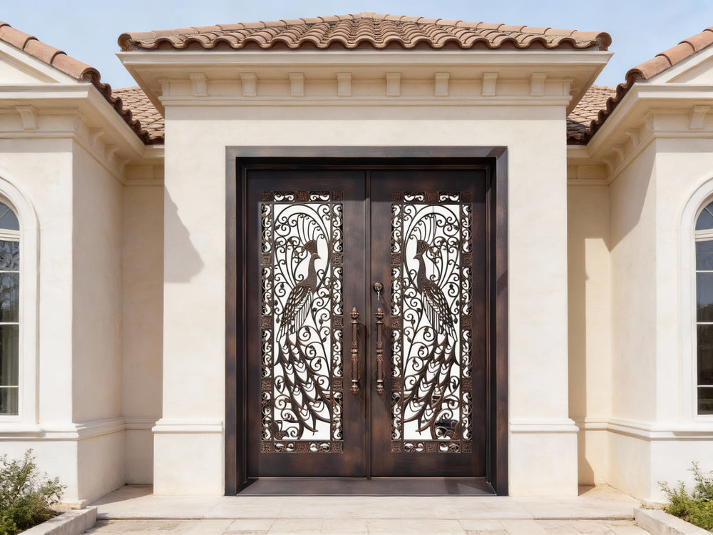 This is a precision-crafted wrought iron double-entry door featuring laser-cut ornamental scrollwork and artistic peacock motifs, symmetrically integrated into both panels. The laser cutting technology ensures crisp, intricate detailing with high repeatability and minimal distortion, achieving an elegant yet durable decorative finish.