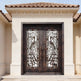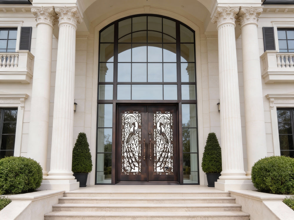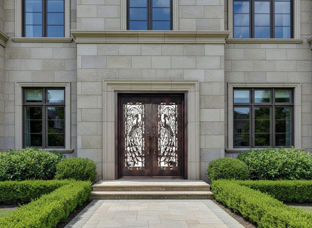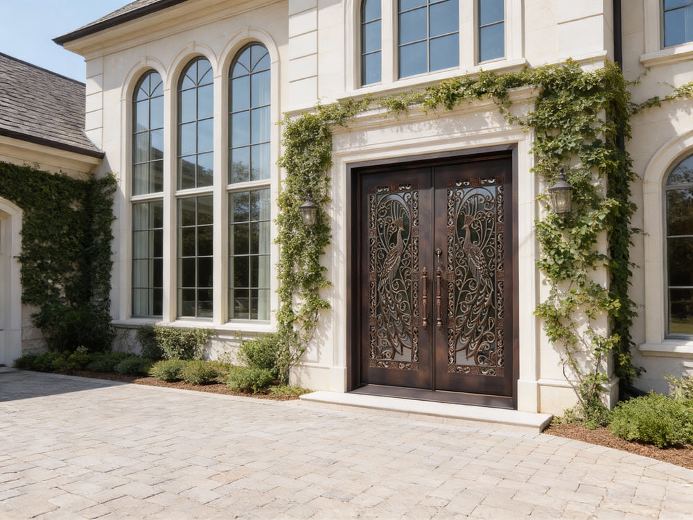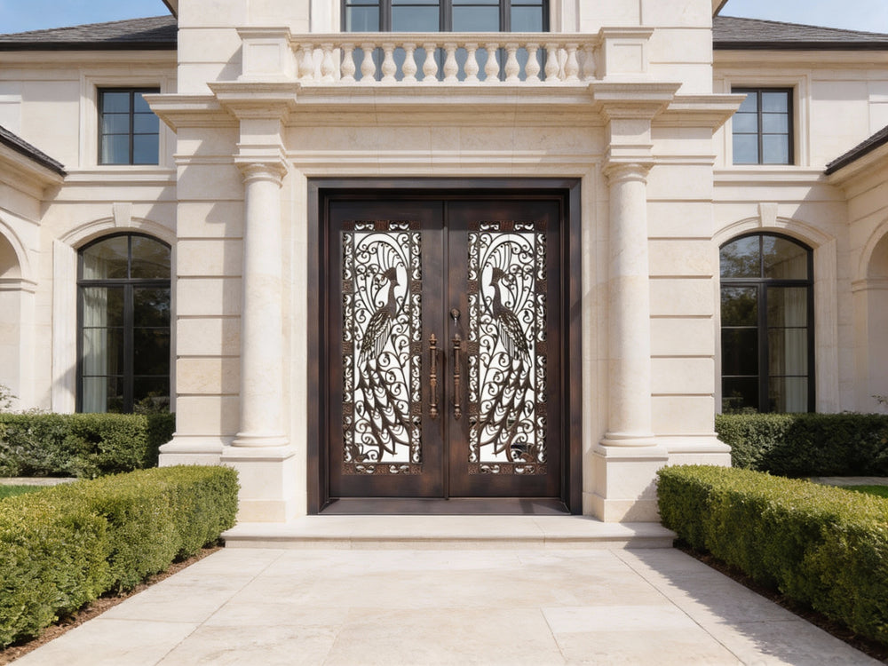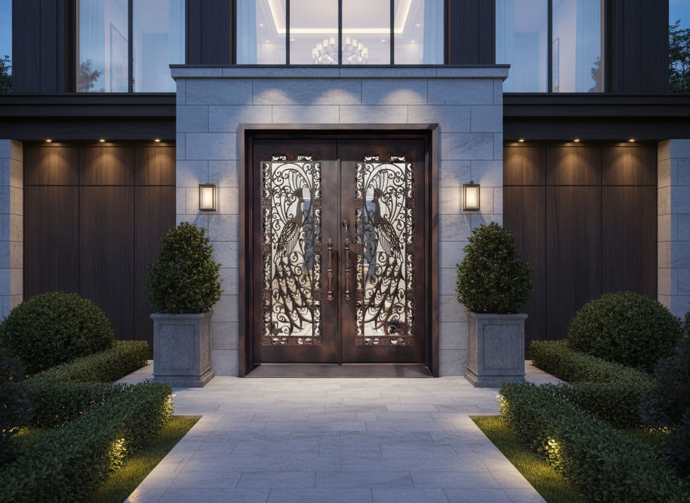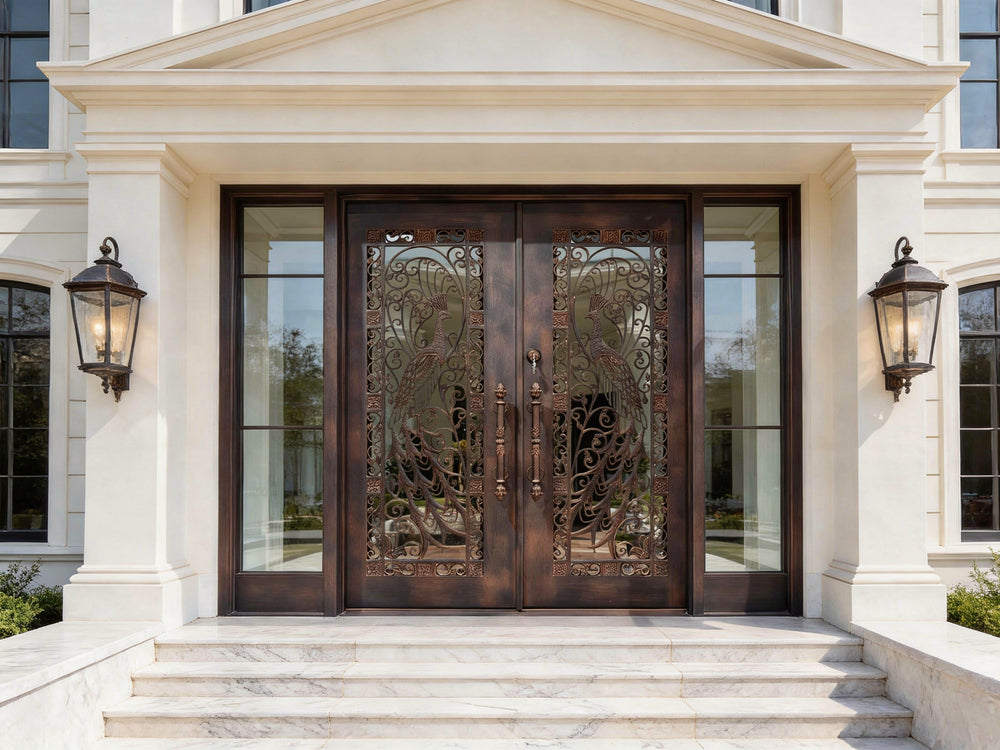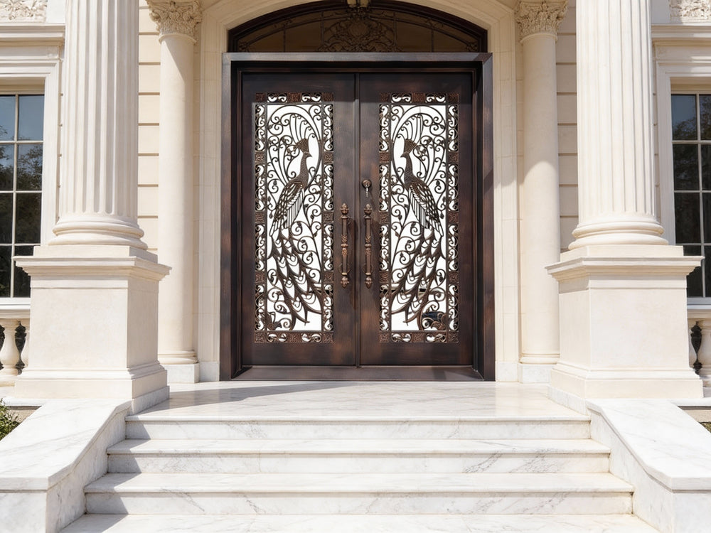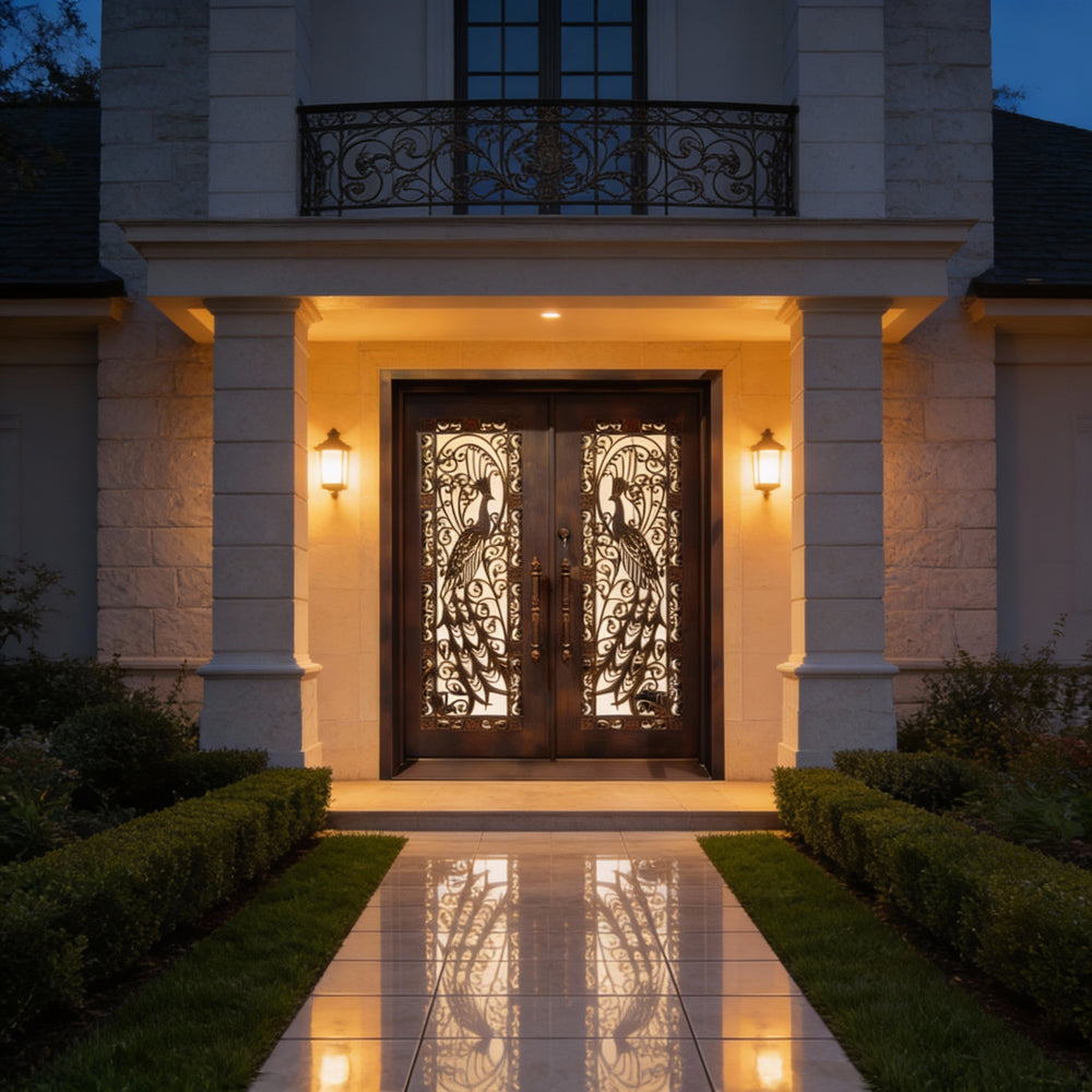 - Design: Dual peacock design with elaborate scrollwork—mirror-aligned across both door leaves