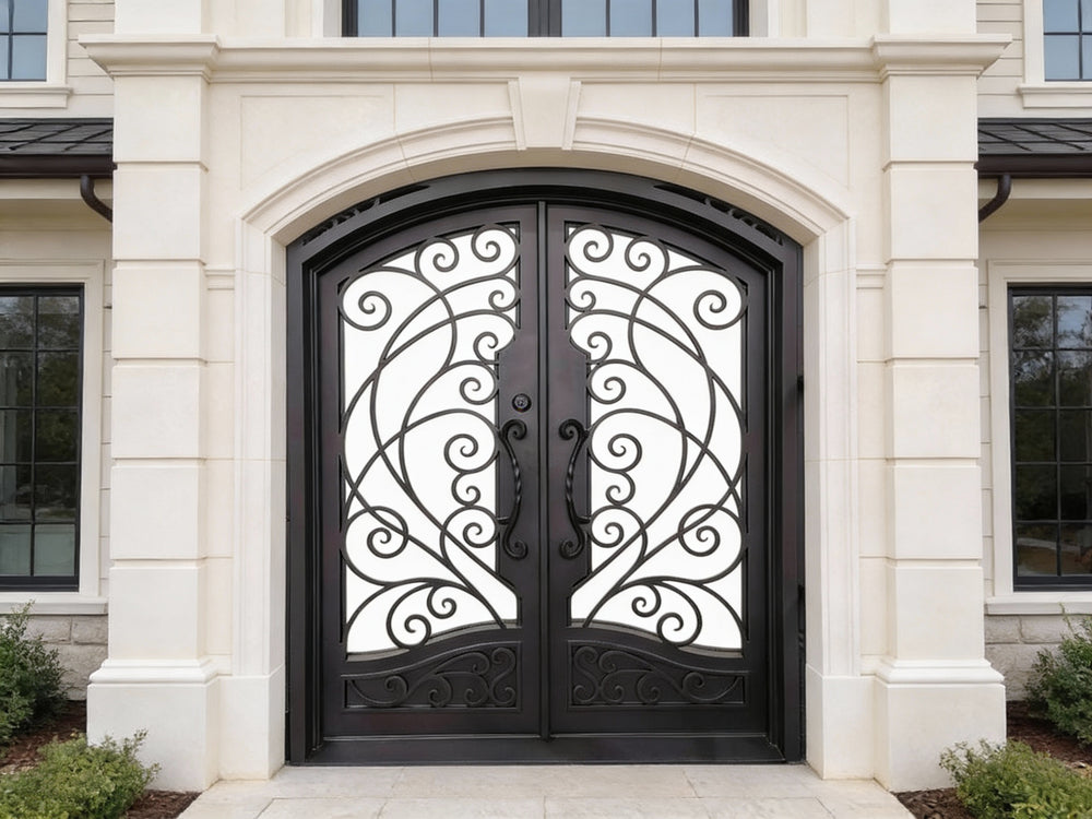 Model IWD1007 blends structured elegance with handcrafted detail, making it a standout choice for classic and modern entrances alike. The square top frame offers architectural symmetry, while the ornate scrollwork delivers visual rhythm across the panel. A decorative kickplate adds both strength and styling at the base, enhancing the door’s premium appeal. Powder-coated in matte black for lasting durability, this design welcomes guests with style, strength, and artisan character.
