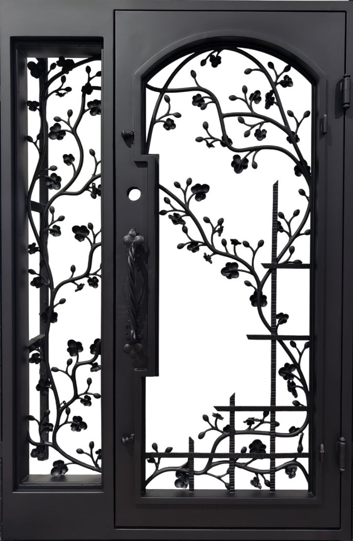 This Square-top double iron door integrates Ornamental Cast iron detailing, featuring a graceful array of cast flowers, leaves, and vine elements. Each botanical piece is formed using traditional sand casting methods, offering dimensional depth and organic artistry that enhances both curb appeal and structural refinement.