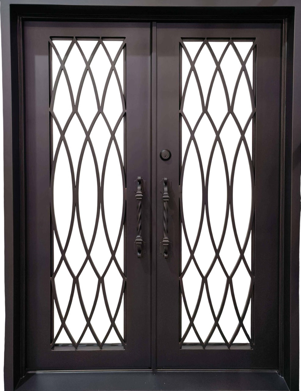 Model ID 973 combines security and geometric precision in a timeless double-door layout. Its symmetrical diamond lattice pattern spans both iron panels from top to bottom, creating a sense of visual texture and strength. Matte black framing and bold center-mounted hardware amplify the door’s stately aesthetic, making it ideal for heritage-inspired homes, transitional architecture, or builds where structural style takes center stage.