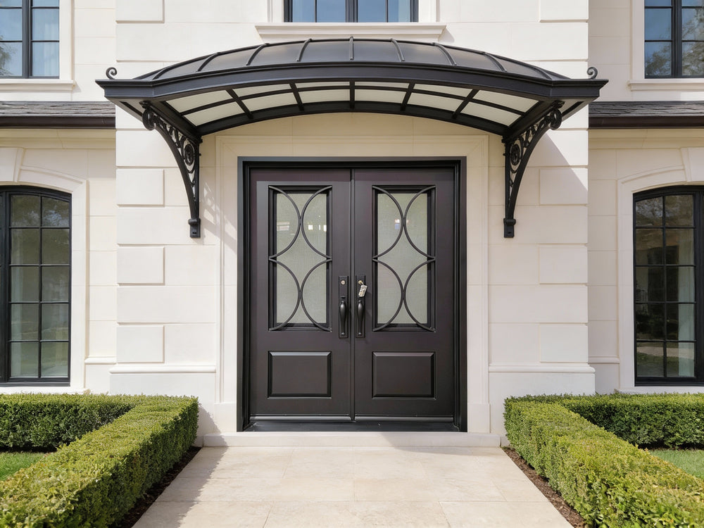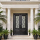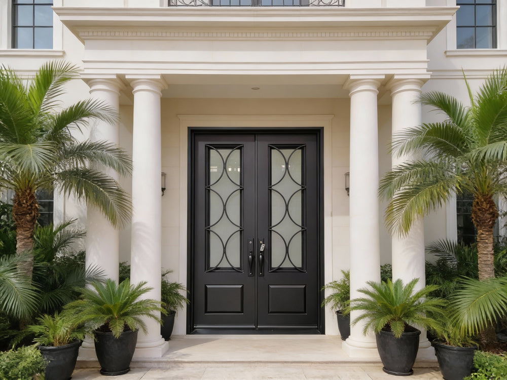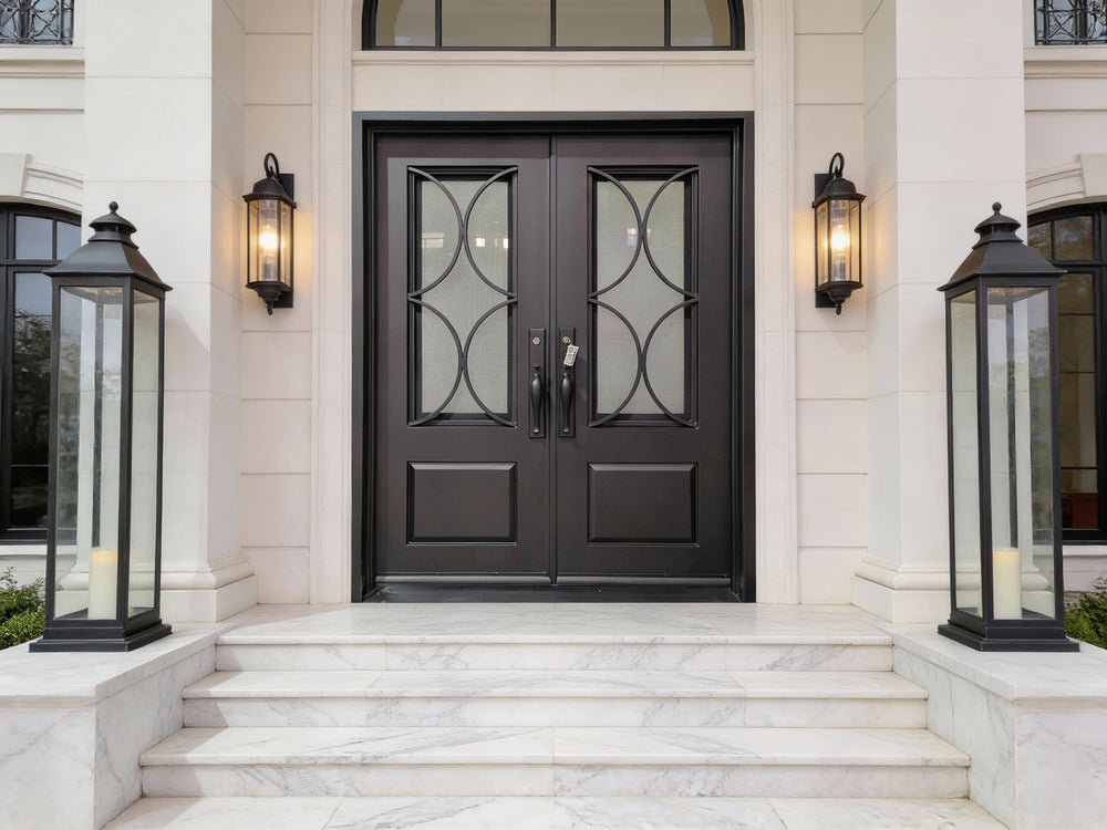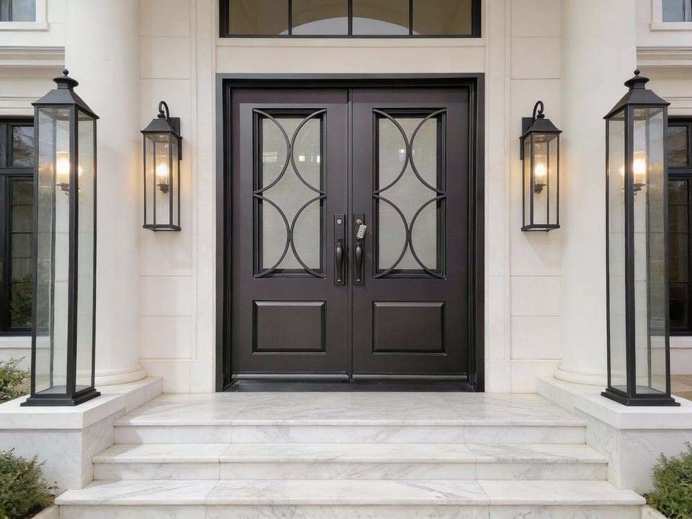 Enhance your curb appeal with Model IWD1005 — a square-top wrought iron double door featuring geometric ironwork and dual textured glass inserts. Blending modern design with durability, this handcrafted entryway offers natural light, privacy, and strong visual impact for custom builds and upscale renovations. Engineered for lasting performance with foam-insulated framing and powder-coated finishing, it’s an ideal solution for style-forward security.