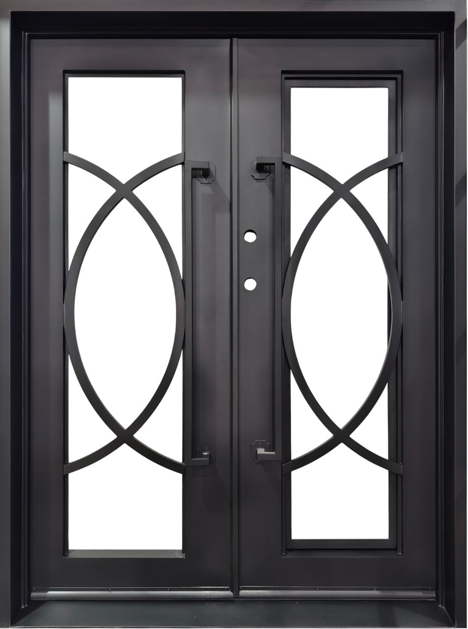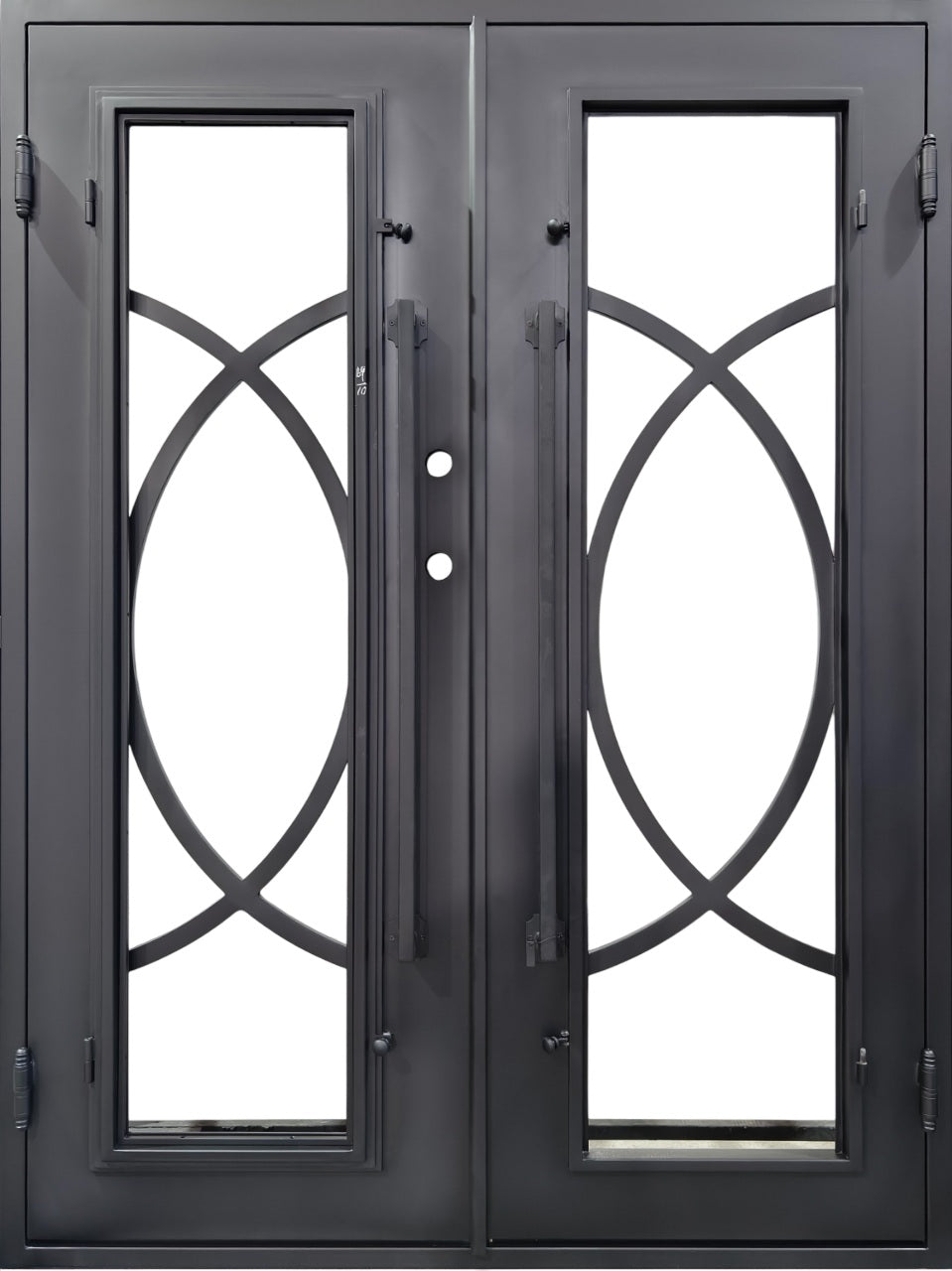 Wrought Iron Double Door with Square Top and Oval Scroll Glass Panel – Model # IWD 1014