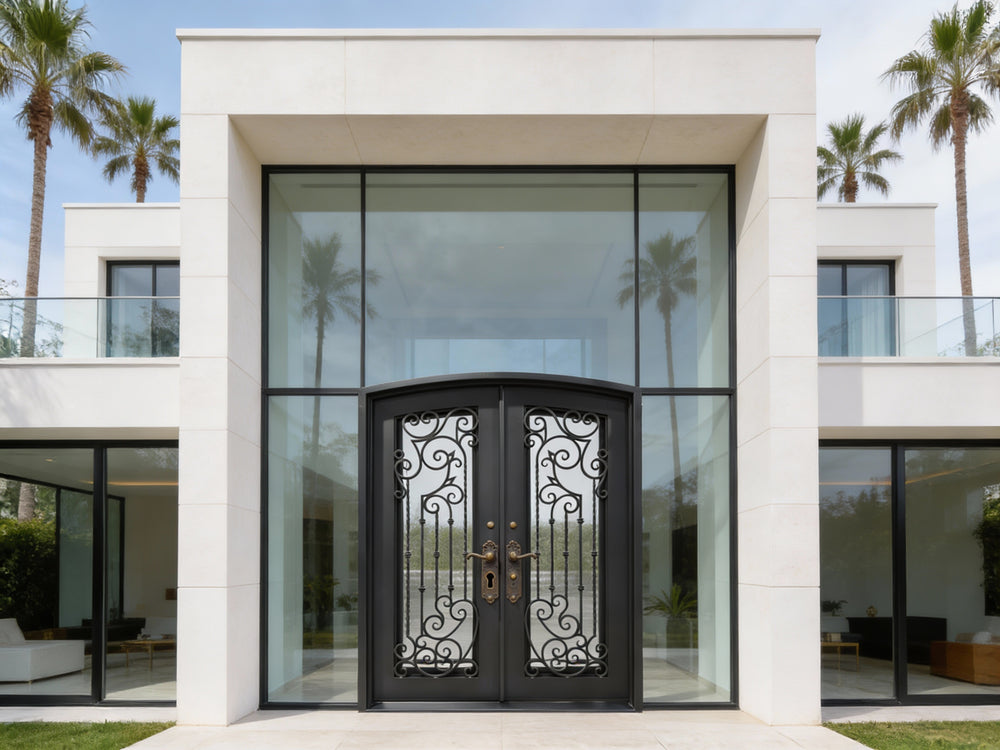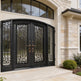 Enhance your property’s entrance with the IWD 1011 wrought iron double door — a blend of vertical twist elements and decorative scrollwork framed in a square top design. Crafted from high-quality galvanized steel and powder-coated in matte black, this entryway offers strength, elegance, and customization. Ideal for luxury homes and commercial spaces, the IWD1013 model brings handcrafted beauty and performance to projects where every detail matters.