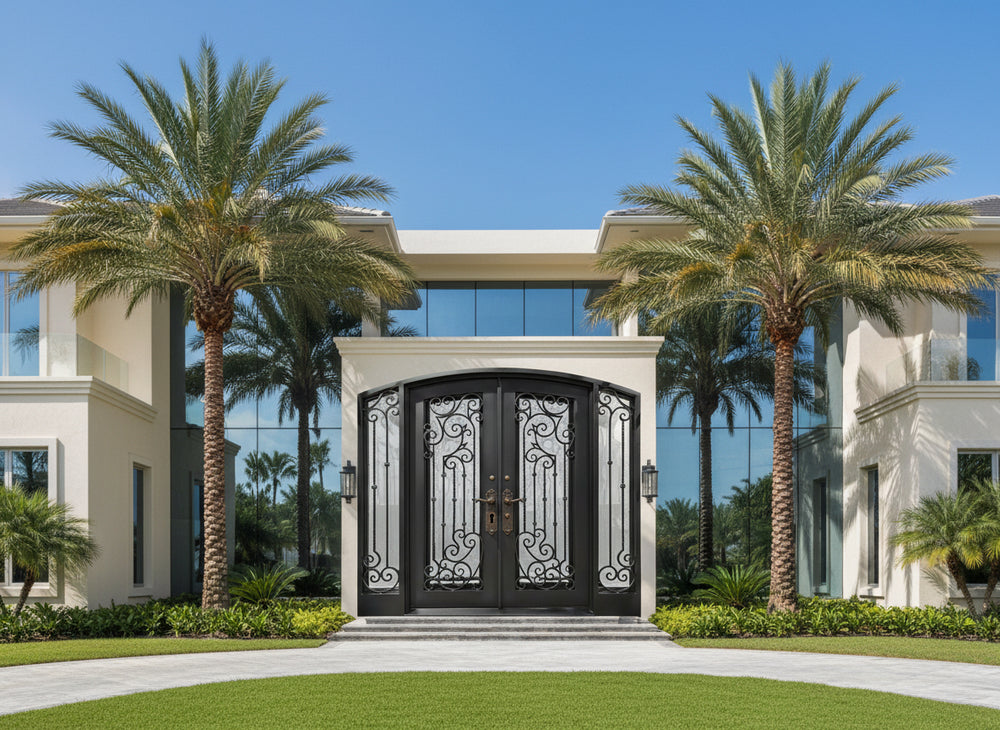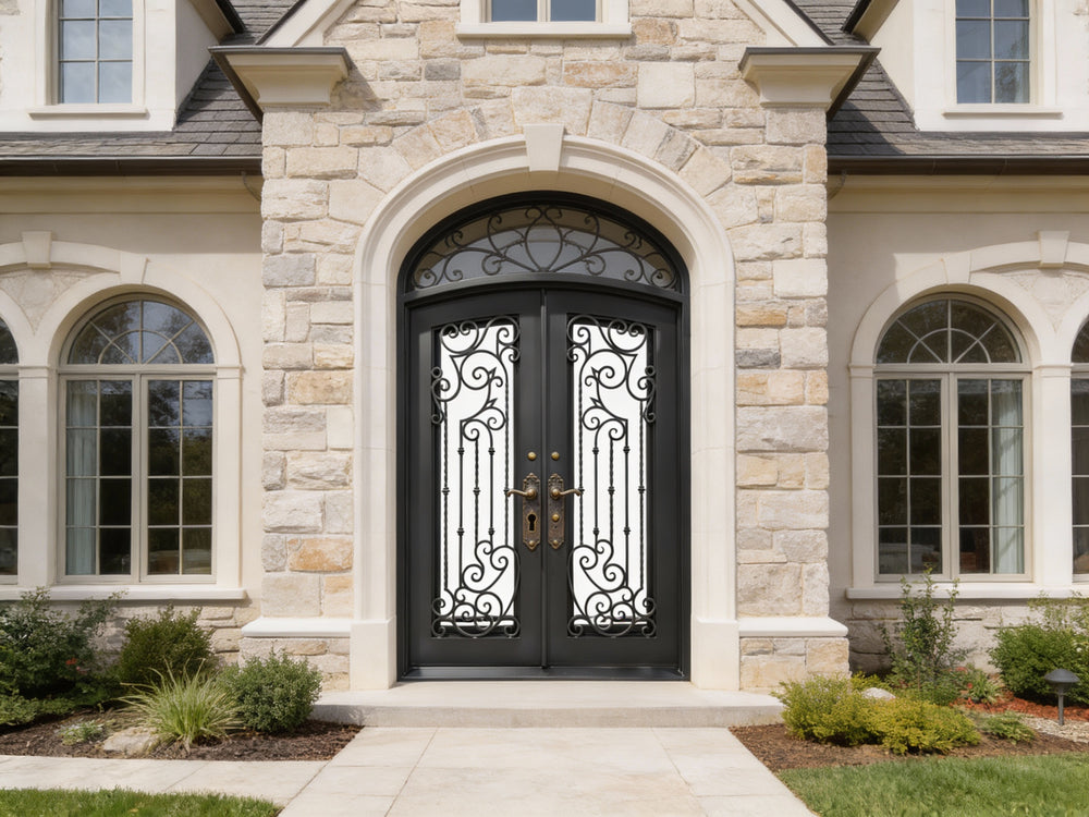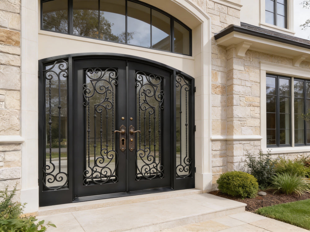 Bring timeless craftsmanship and bold presence to your front entrance with Model IWD 1013. This double iron door showcases symmetrical vertical twist bars accented with hand-forged scroll clusters, forming a composition that speaks to classical artistry and robust design. Its square top profile enhances architectural sharpness, while the scroll elements soften the structure with graceful curves. Built for high-traffic entrances and elegant facades, this design balances strength, style, and versatility for lasting impact.