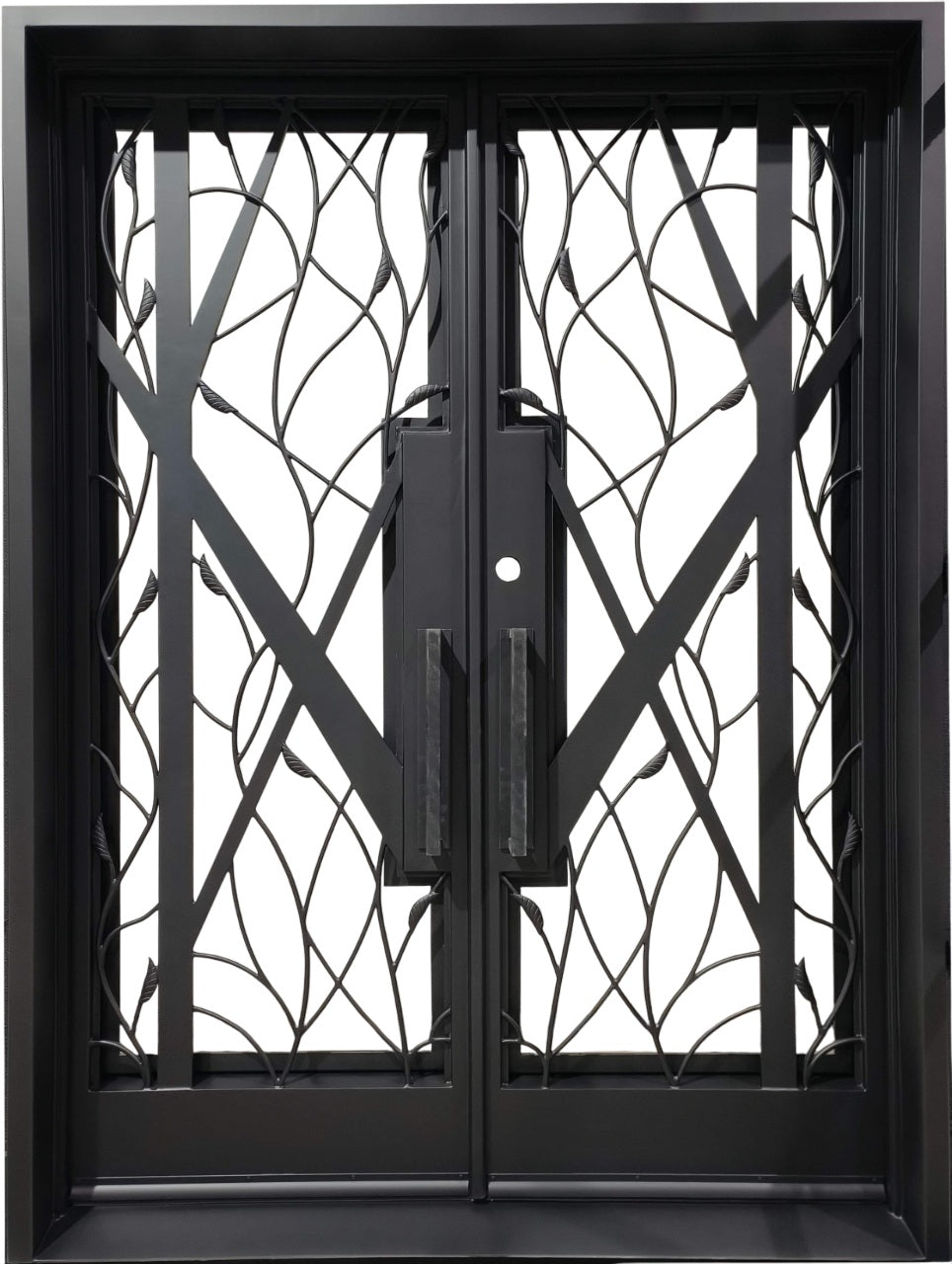 Model IWD 972 pairs classic fleur-de-lis artistry with full-panel vine scrollwork across a square-top double iron door. Finished in matte black and crafted from galvanized steel, it offers strength, visual elegance, and seasonal insulation for custom builds and heritage-inspired entrances. Fully customizable and expertly constructed, this model adds timeless character to modern or traditional architecture.