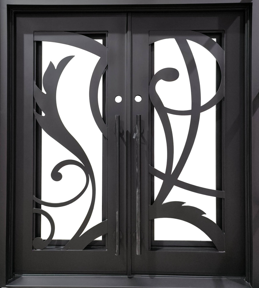 Model IWD 990 delivers a stately entrance through ornamental symmetry and handcrafted ironwork. Each panel showcases full-length vine scrolls anchored by dual circular medallions, offering traditional flair with modern structural integrity. The kickplate panels ground the design visually, while the matte black finish enhances contrast and resilience. Ideal for upscale homes and curated renovations, this model blends strength, elegance, and design clarity.