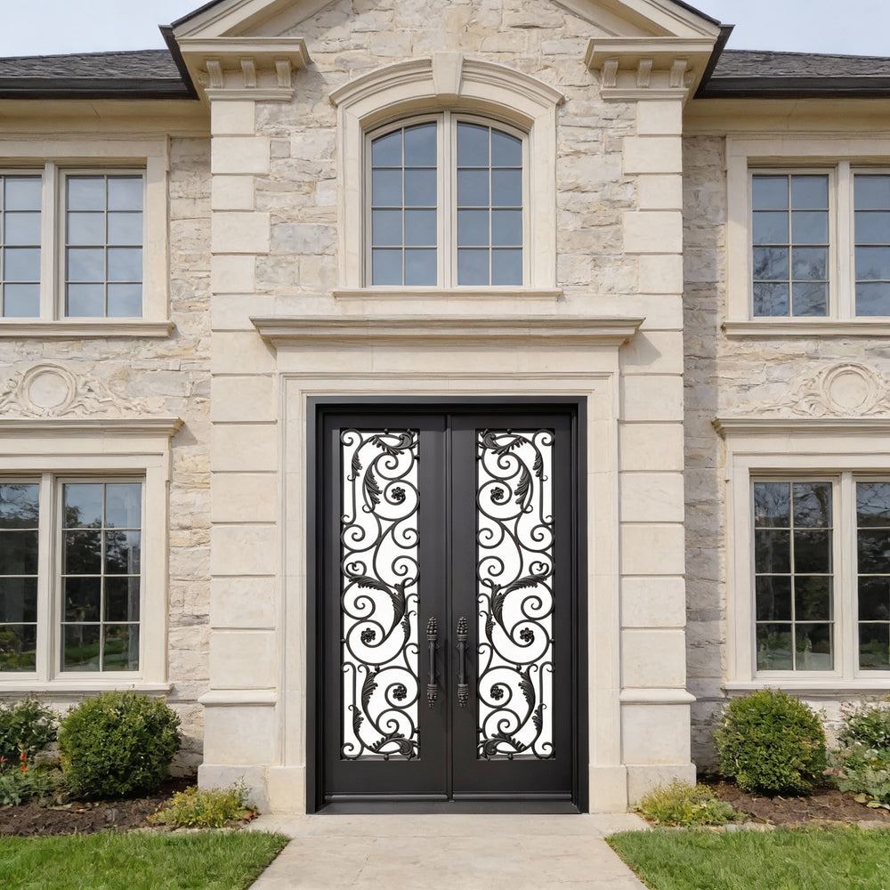 Wrought Iron Double Swing Front Door | Square top with top window | Model # IWD936