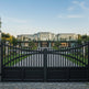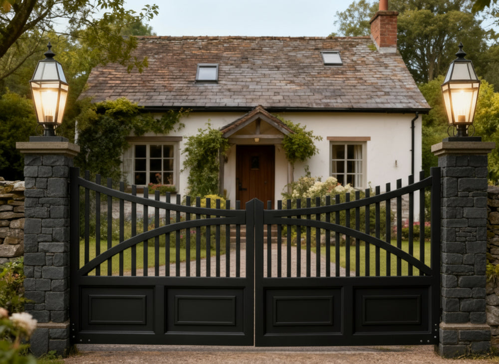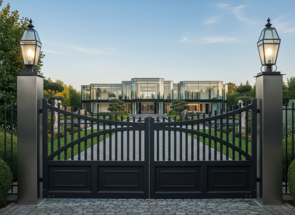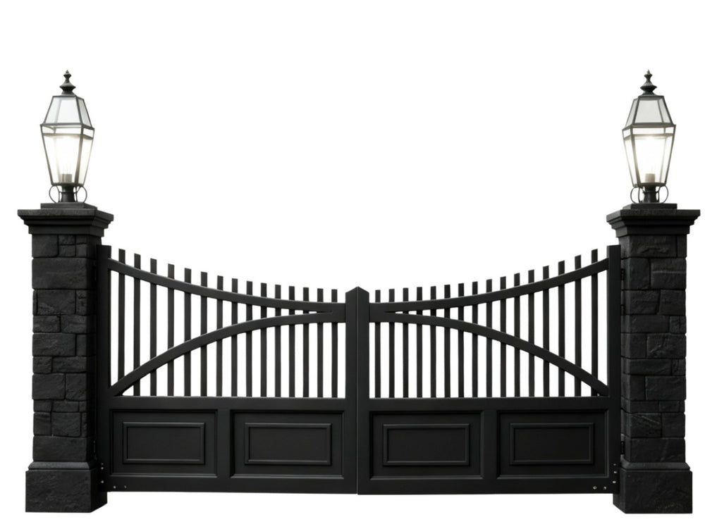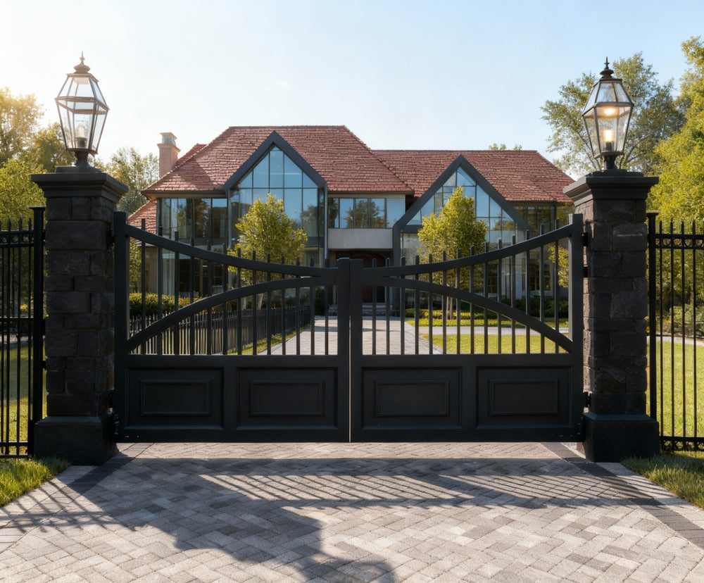 A gate that stands with quiet authority. dual swing panels with vertical bars rising into a graceful arch, framed by solid lower panels with rectangular insets. The flanking dark brick pillars—each topped with an illuminated lantern—anchor the design in timeless sophistication. This gate evokes strength, symmetry, and architectural harmony.