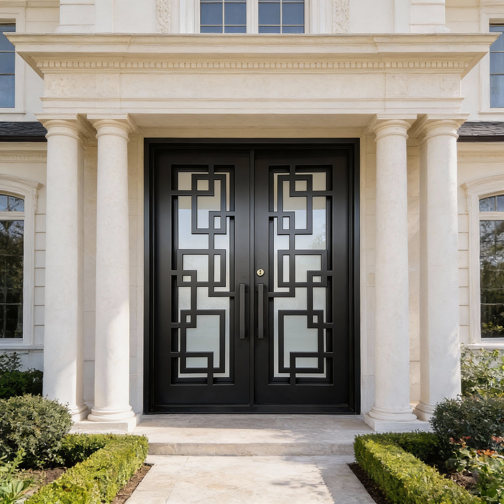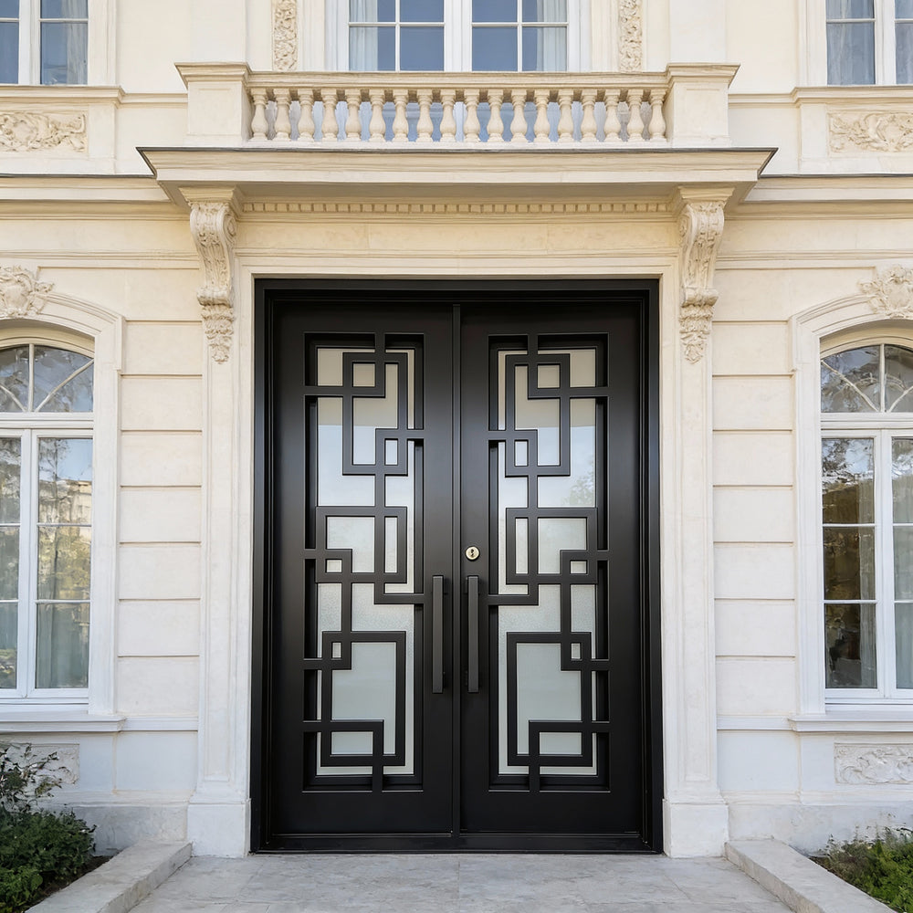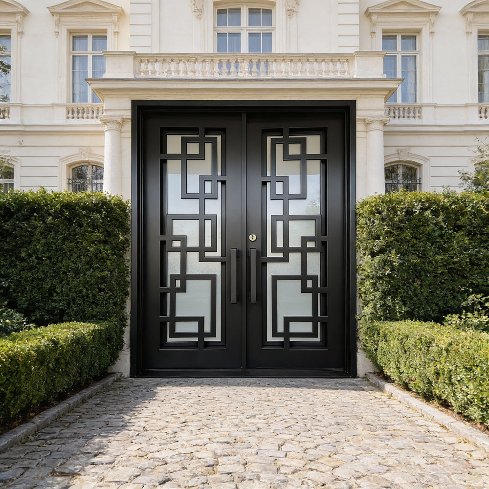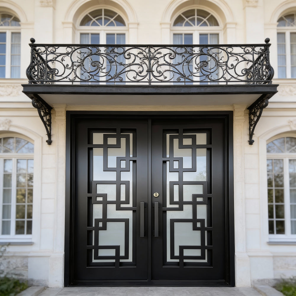 Model IWD971 features a square-top silhouette enhanced by traditional iron scrollwork and a bold kickplate base. Its double glass inserts, forged detailing, and robust matte finish create visual depth while offering airflow and privacy. Built for resilience and classical charm, this model embodies strength and style — ideal for heritage façades and upscale home entrances.