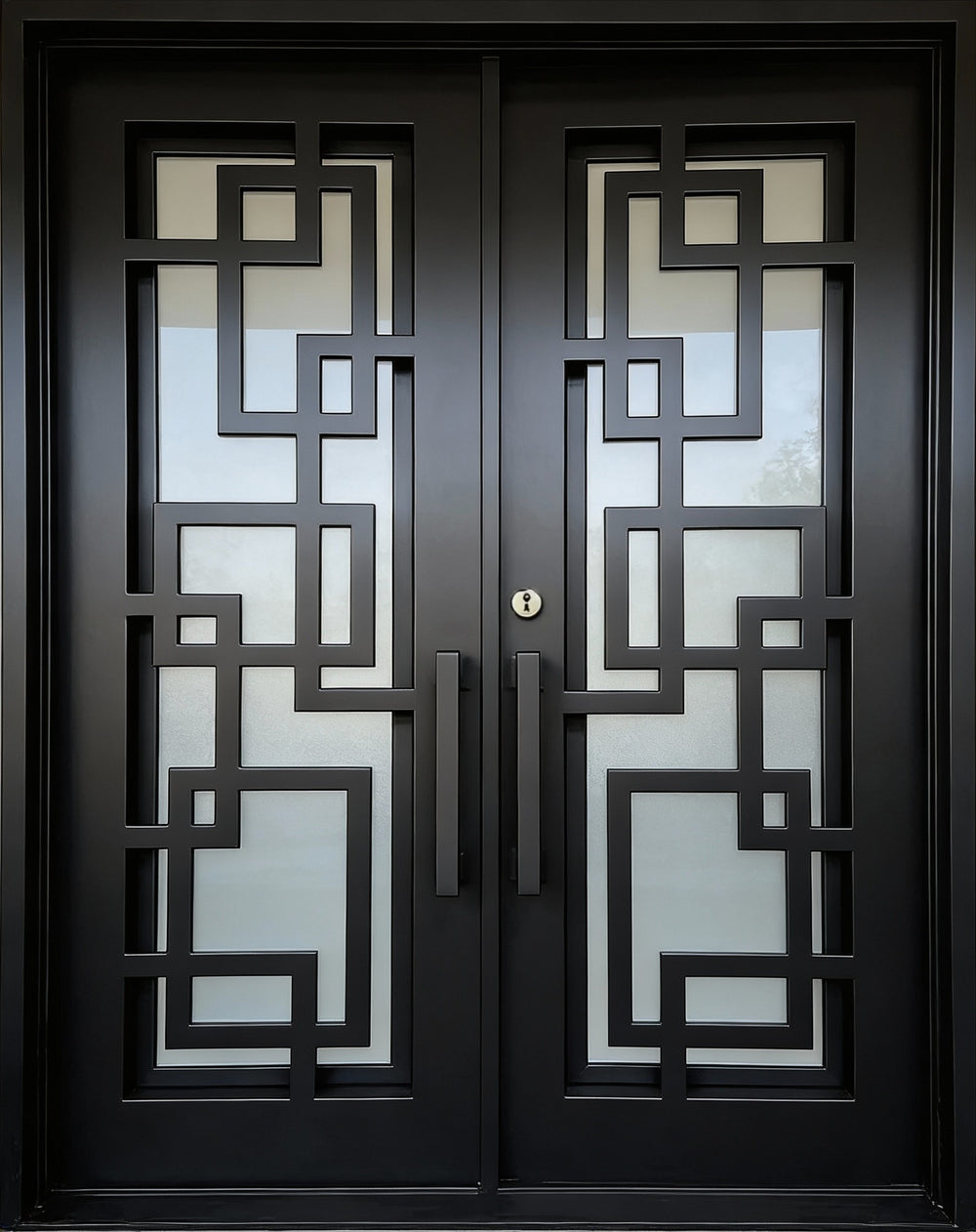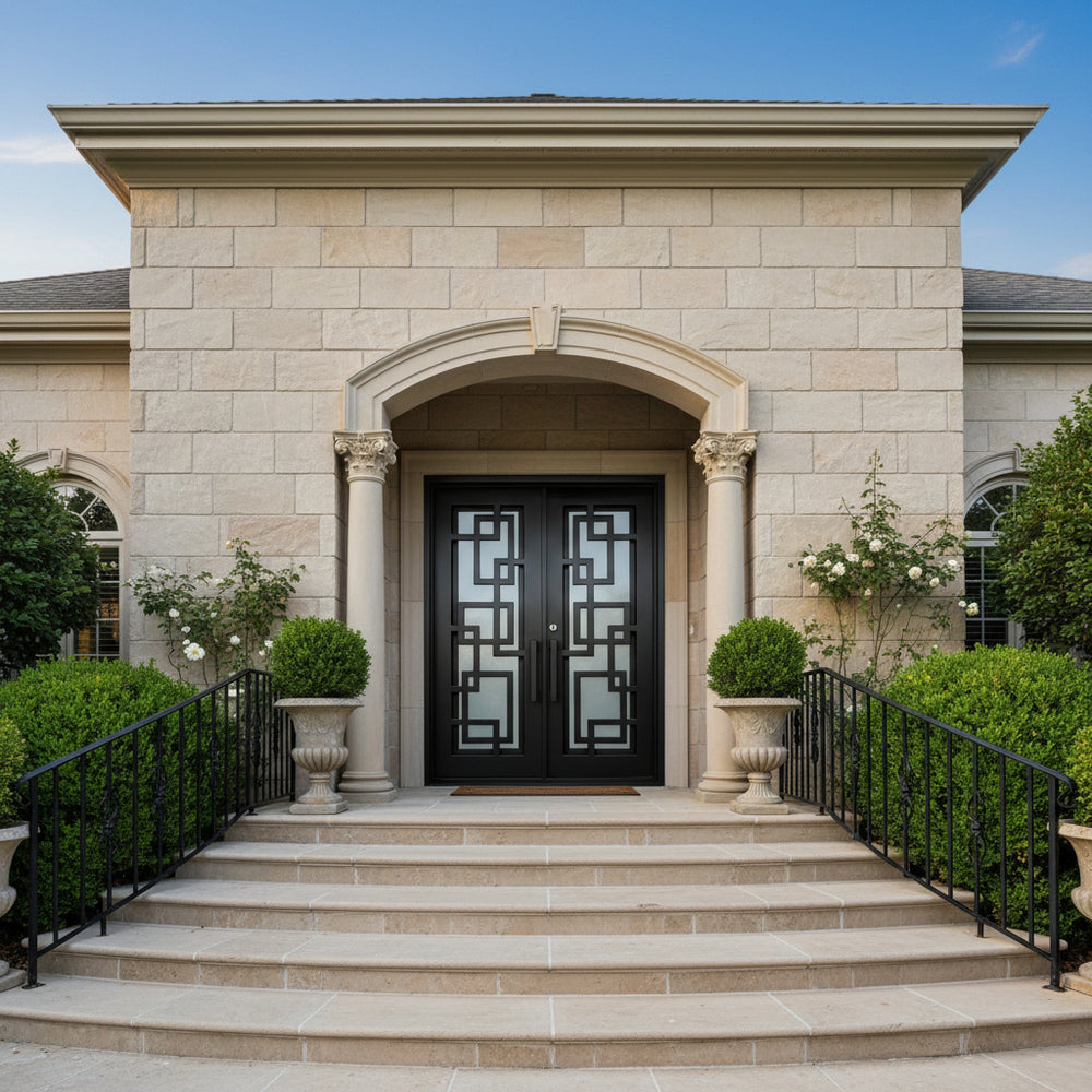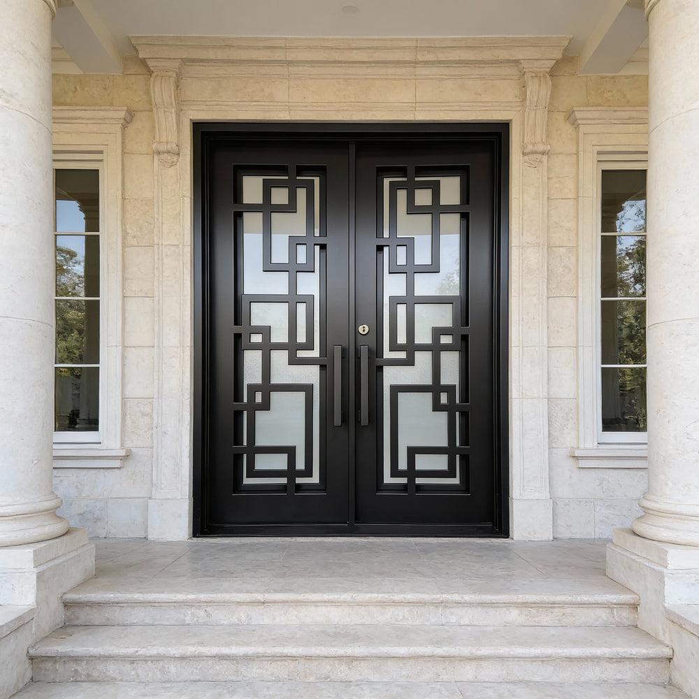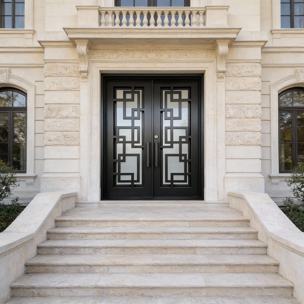 Model IWD971 features a square-top silhouette enhanced by traditional iron scrollwork and a bold kickplate base. Its double glass inserts, forged detailing, and robust matte finish create visual depth while offering airflow and privacy. Built for resilience and classical charm, this model embodies strength and style — ideal for heritage façades and upscale home entrances.