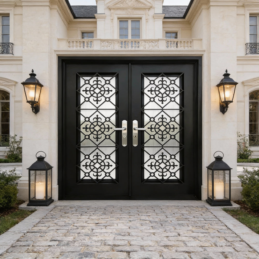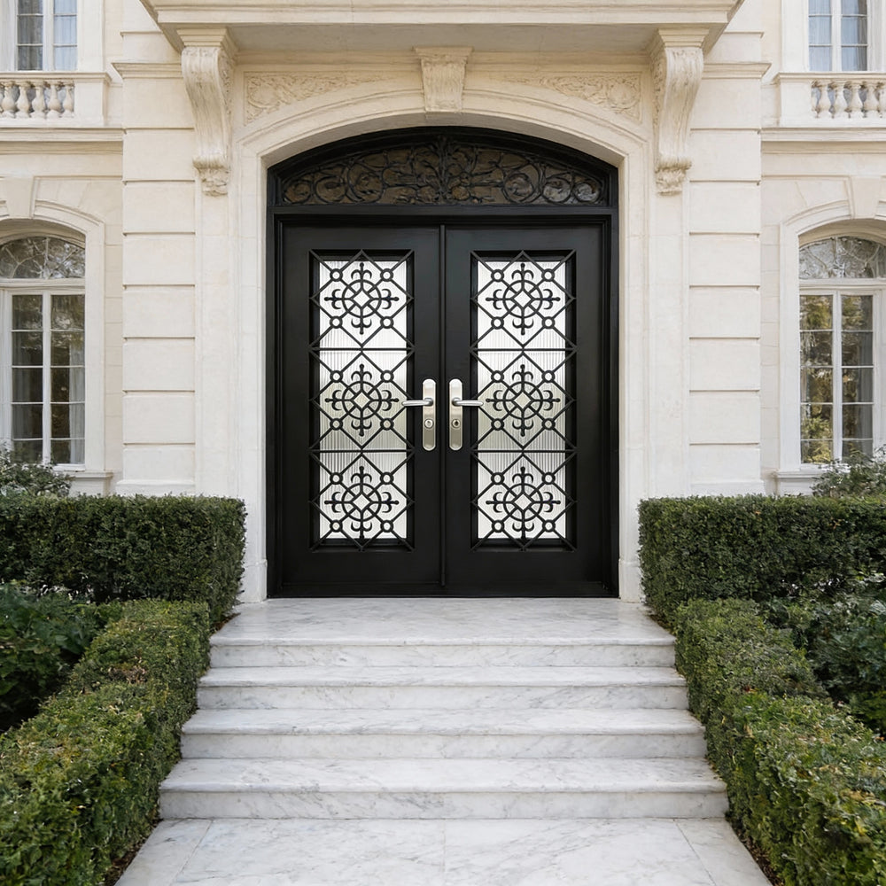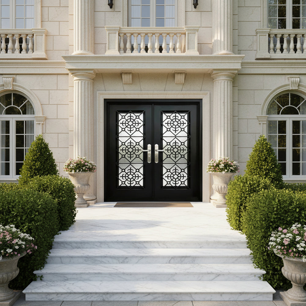 - Three-Tier Scroll Panels – Ornamental ironwork flows vertically across each door leaf