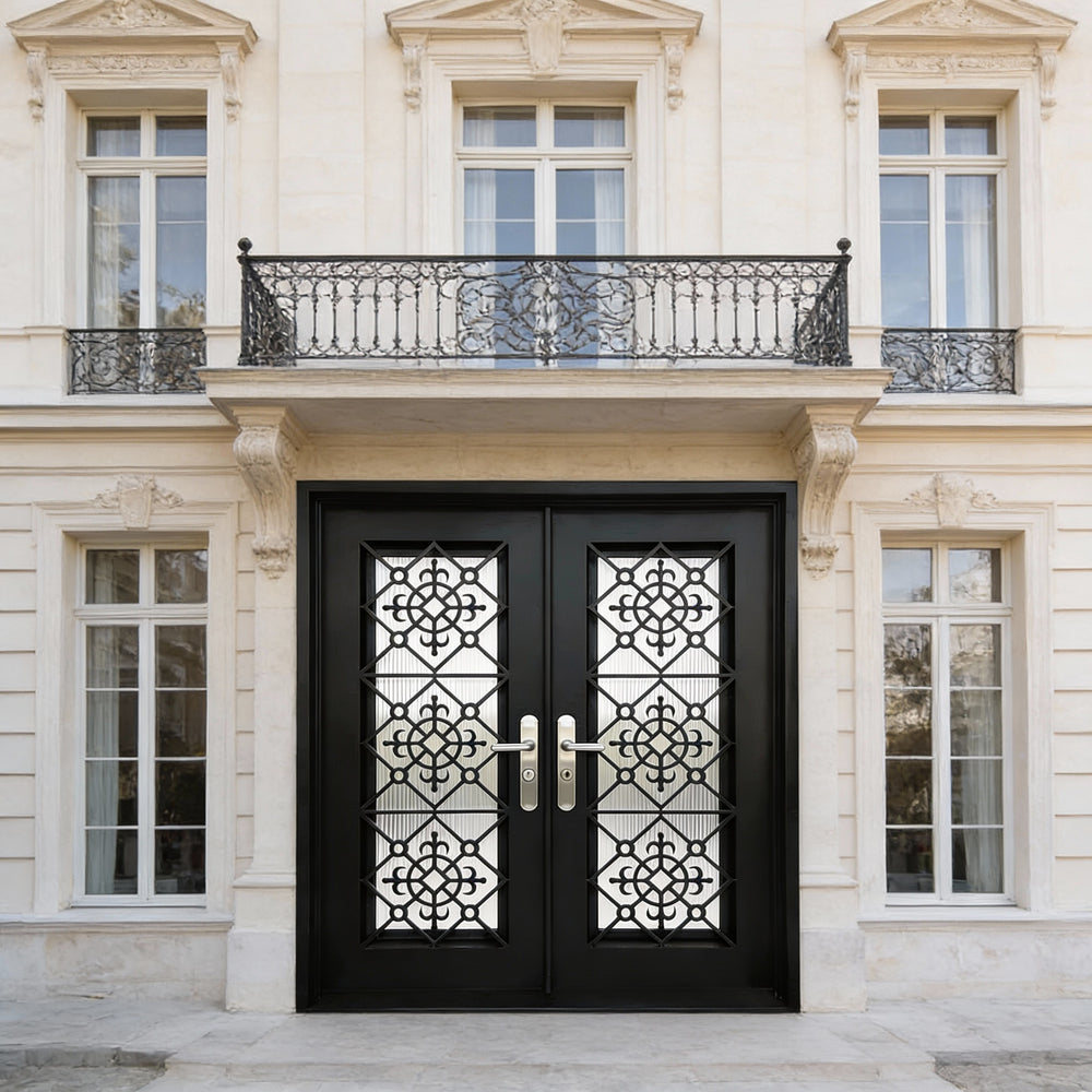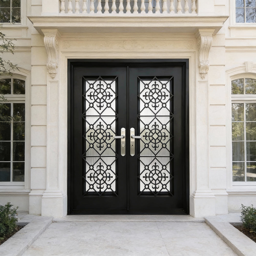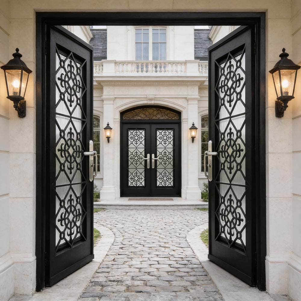 Model IWD966 delivers a timeless blend of ornamental design and structural durability. With its square-top frame and vertically stacked scroll panels, each leaf showcases detailed hand-forged ironwork anchored by a bold kickplate at the base. The double operable glass panes offer ventilation and light control while maintaining privacy. Finished in matte black with optional customization, this model is ideal for heritage-style homes or elegant modern builds where visual rhythm and resilience meet.